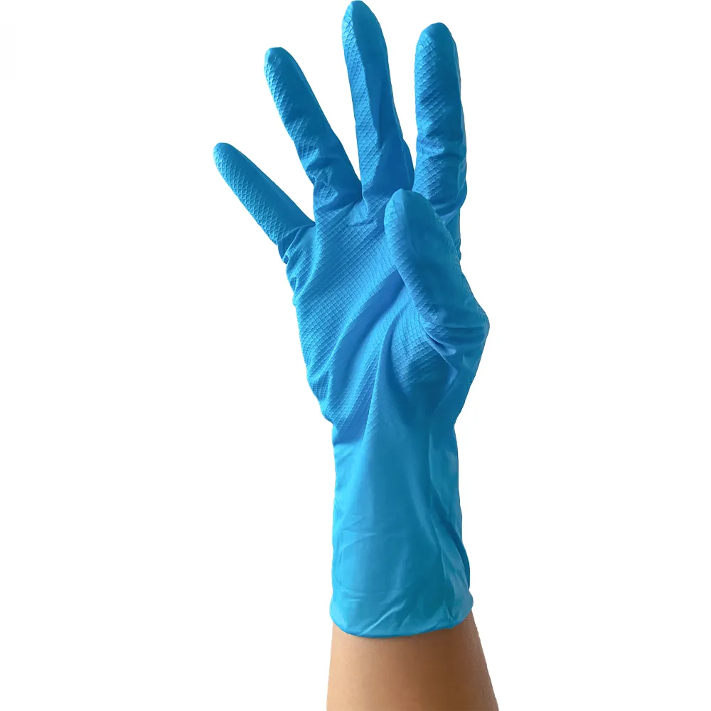 Presentamos nuestros guantes nitrilo escamas de pescado azules de 12 pulgadas 8 Mil Flocados, diseñados para proporcionar protección ambidextra con un patrón de escamas de pescado distintivo para una excelente performance de agarre.